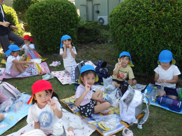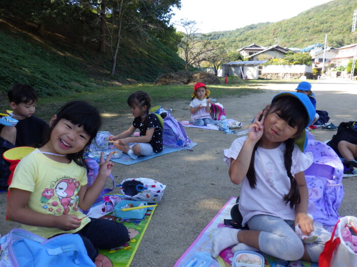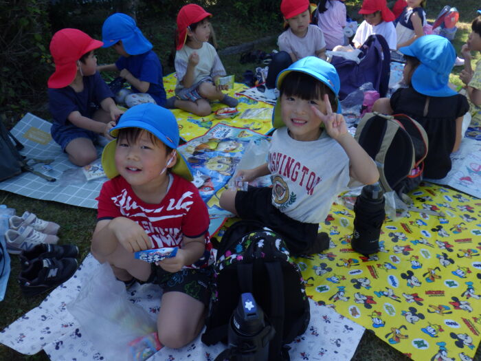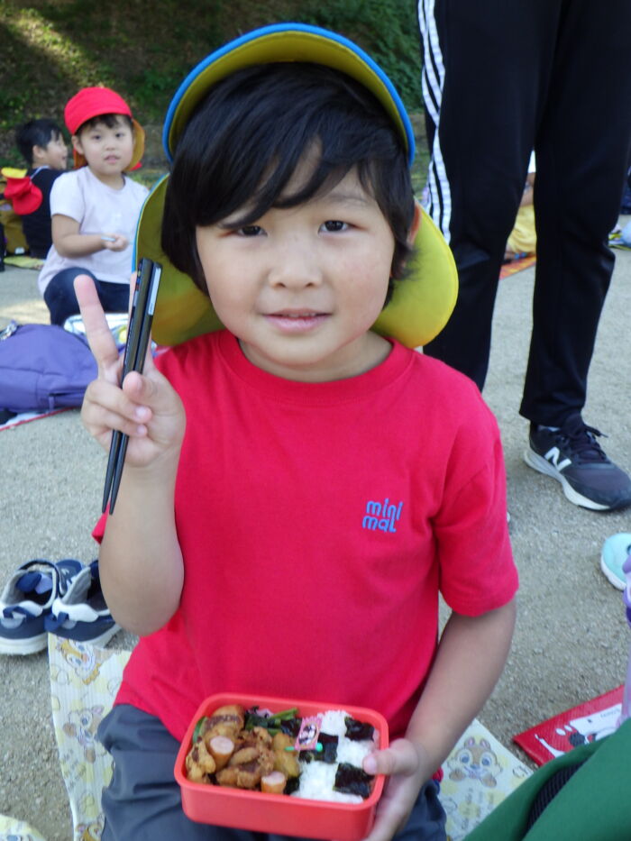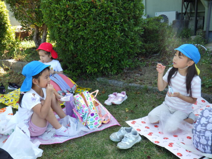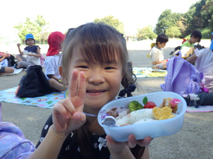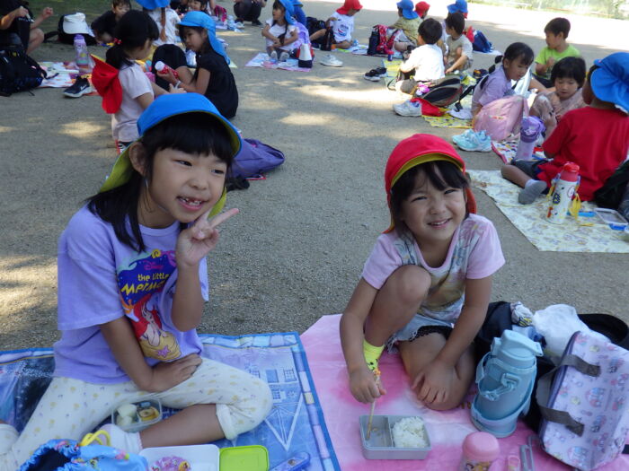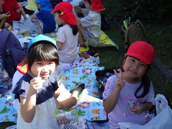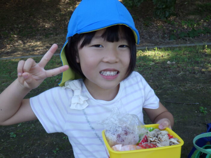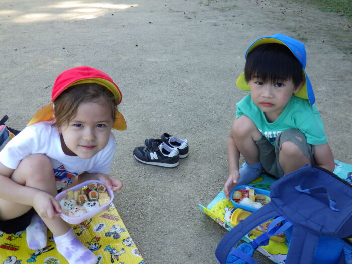 公園へ着いたらお弁当の時間です!ペアの友達と一緒にシートを敷いて、気になるお弁当の中身は…