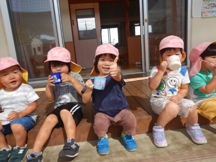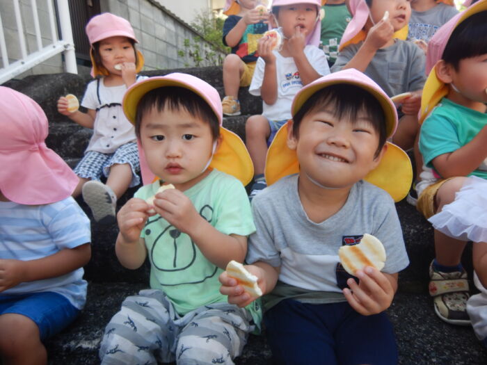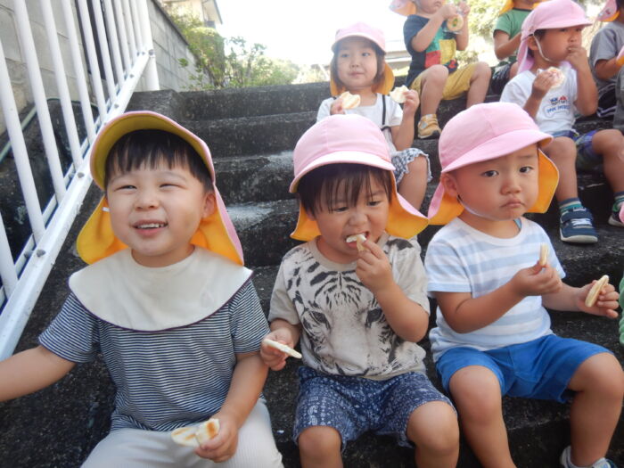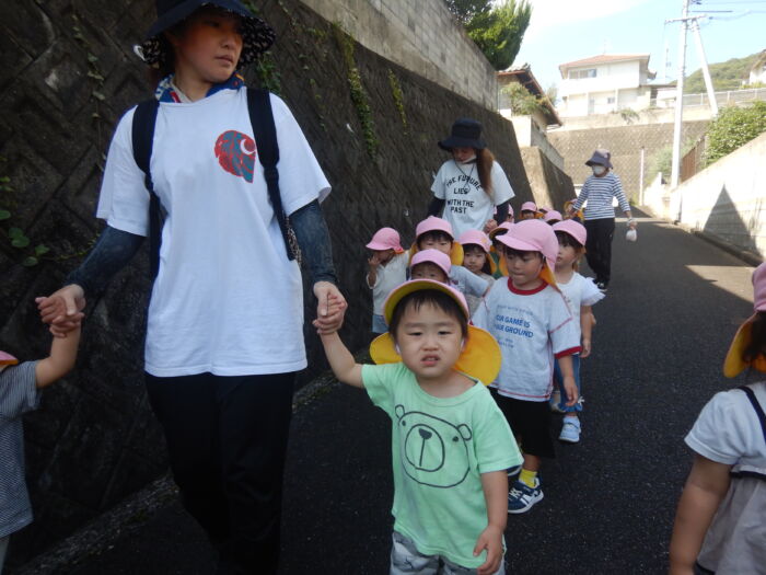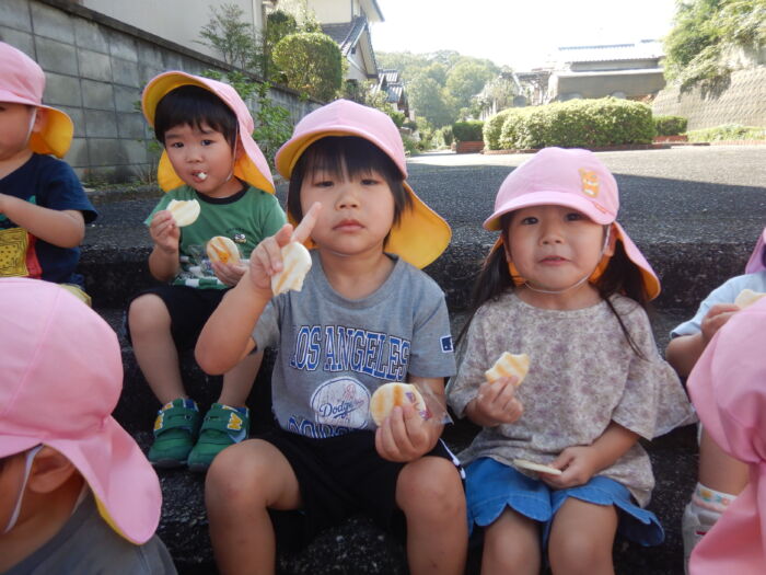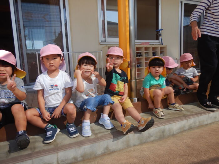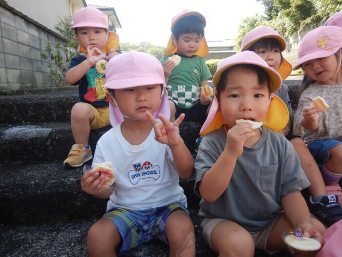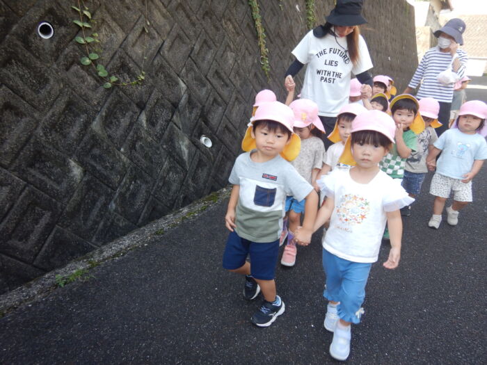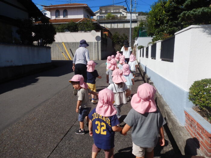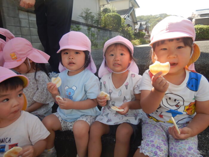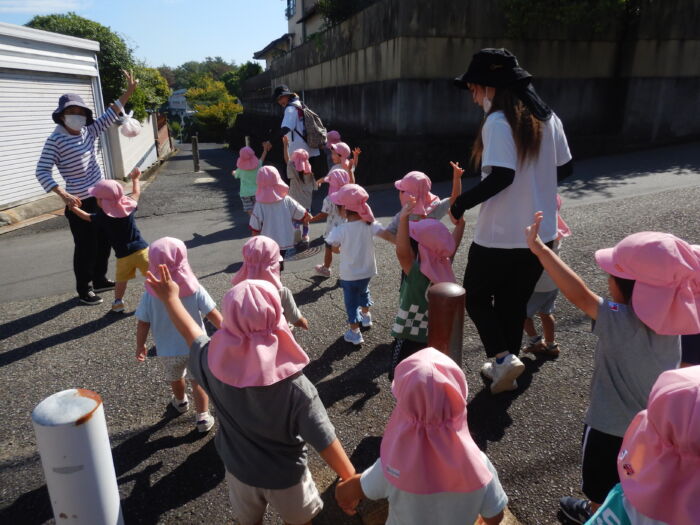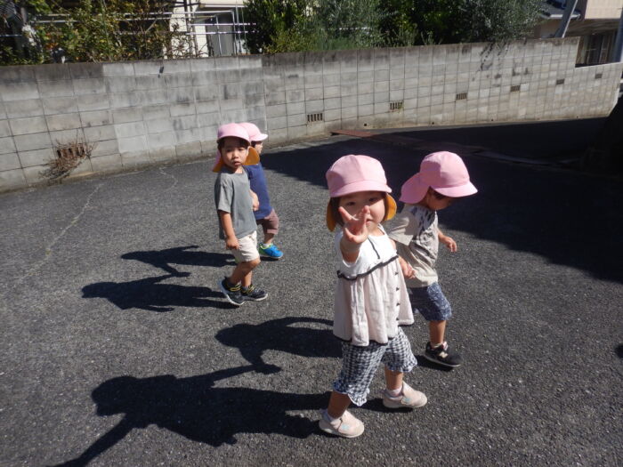 きく2歳児 お散歩に行ったよ《菊組》 2025年10月7日 100 今日は緑道公園まで散歩に行きました。靴を履いて準備オッケー! 友達と二人組で歩きました。上手に前を見て歩けるかな・・・ みんなで集合写真を撮った後、お菓子を食べ、嬉しそうな菊組さん。外で食べるおやつは格別だね~! 車通りを見てから園に戻りました。 たくさん歩いた後のお茶は最高~!! 遠足に向けて道路をもう少し上手に歩けるようにしていこうね。