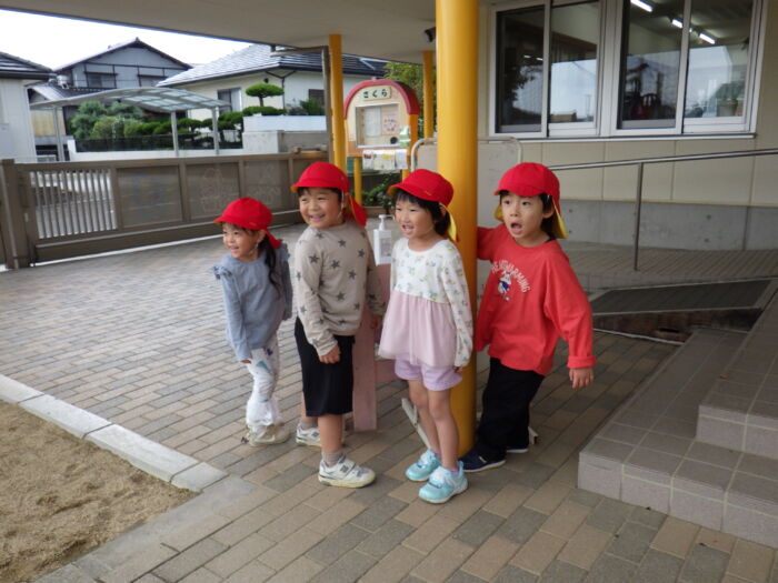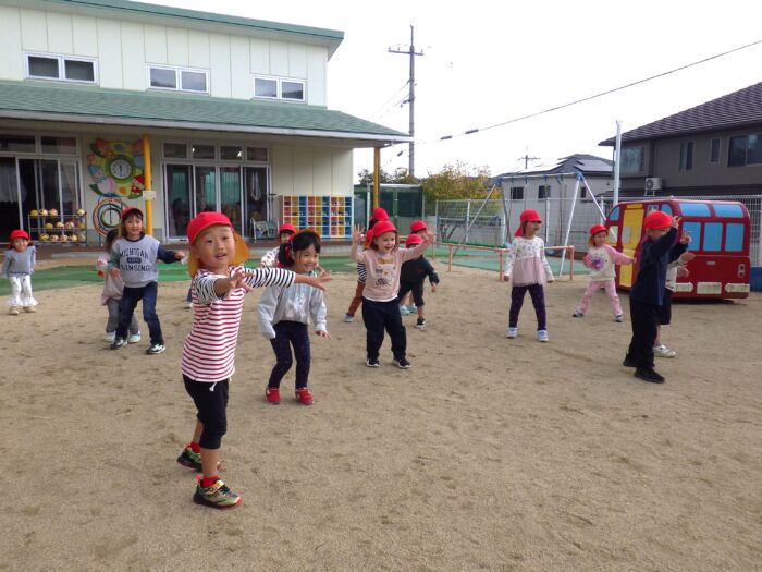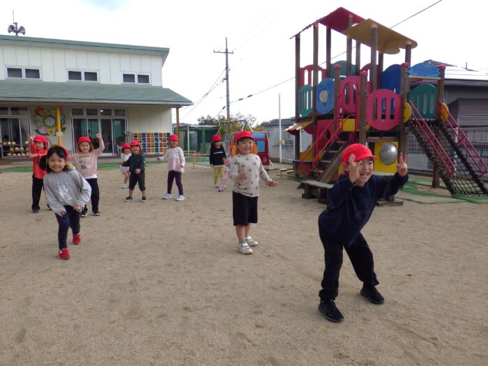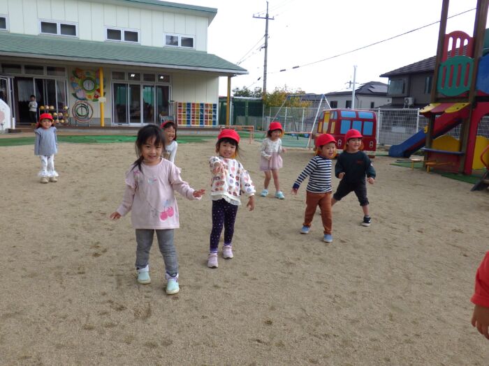 もも4歳児 だるまさんが転んだ!《もも組》 2025年10月27日 30 最近のもも組さんのブームは「だるまさんがころんだ」!! 全員で遊んで楽しんでいます(^^)/ だるまさんが・・・ ころんだ!!! 止まる時にポーズを決める子どもたちが、とっても可愛くて面白いです♡ この後は子どもたちからのリクエストがあり、全員でかくれんぼをして楽しみました( *´艸`)