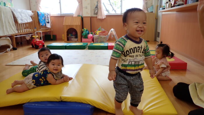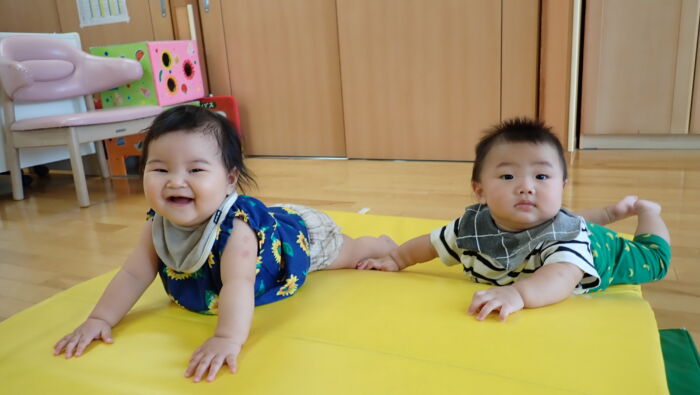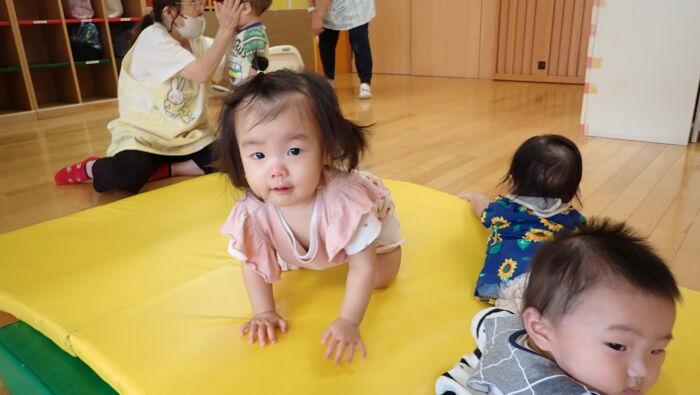 たんぽぽ0歳児 マットで遊んだよ《たんぽぽ組》 2025年8月26日 64 今日はマットで遊びました。歩いたりハイハイできる子はマットの上に上がったり下りたりすることを楽しみました。ハイハイができない子も、マットのひんやり感を味わったり、腹這いになって方向転換していつもと違う感覚を楽しんだりした。みんなご機嫌な様子でしたよ