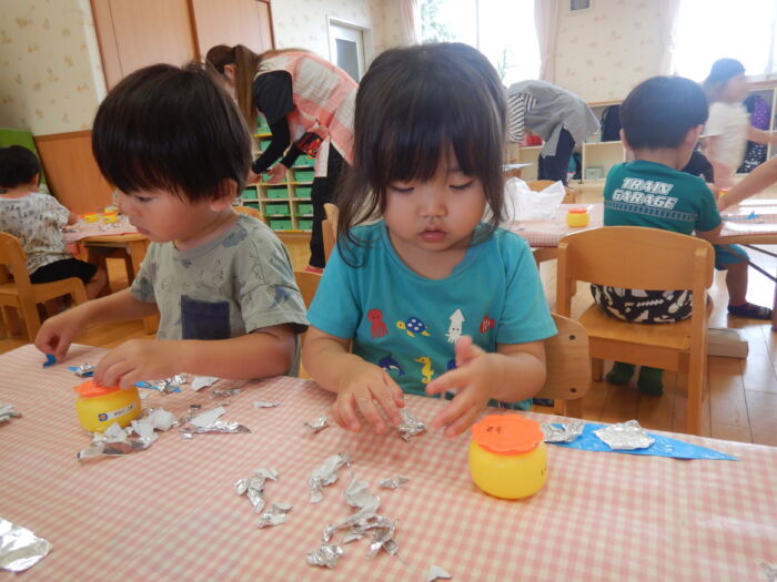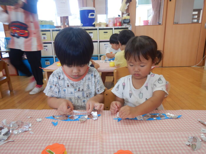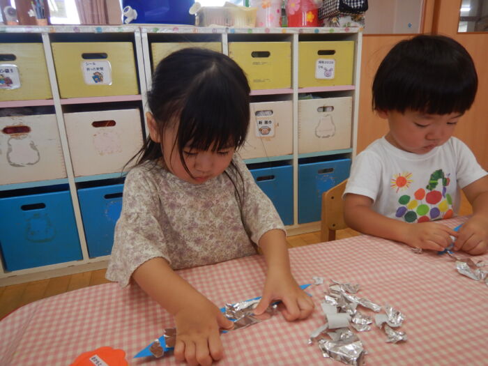 キラキラ光る折り紙に興奮した菊組さん☆