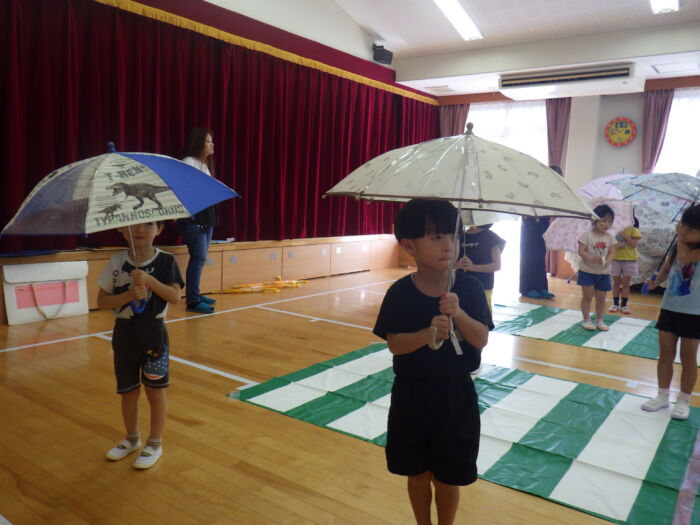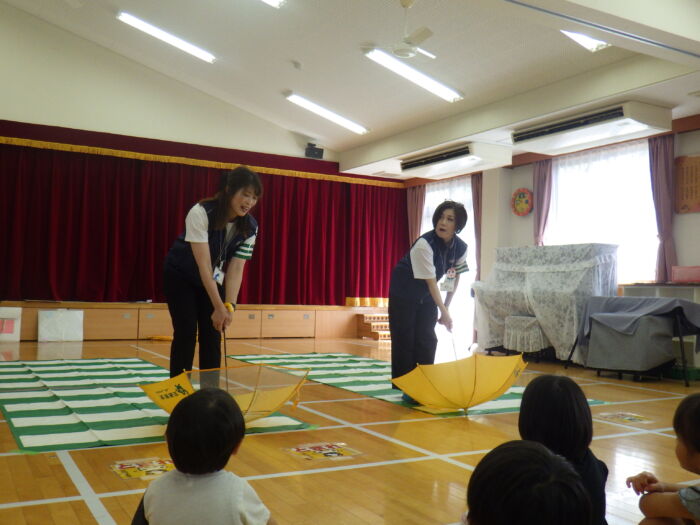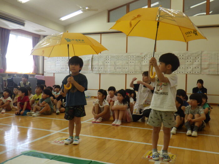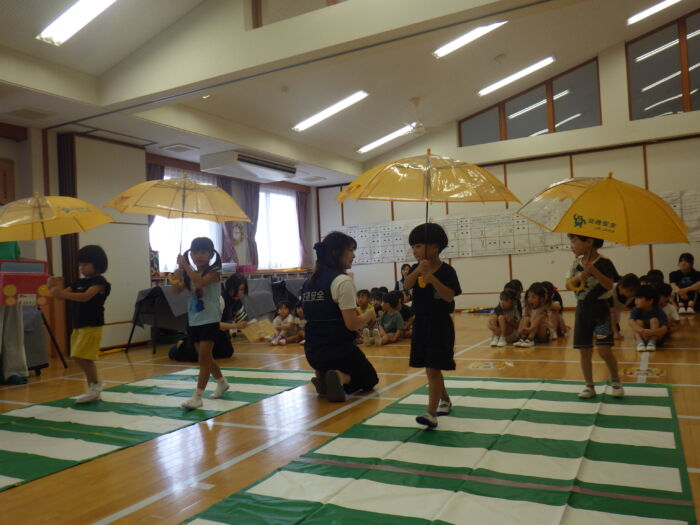 うめ5歳児 第2回交通指導がありました《うめ組》 2025年8月22日 89 交通指導がありました。 今回の指導では傘の持ち方やさし方、たたみ方を教えてもらいました。 安全に使う使い方を教わった子ども達は、早速やってみることにしました。 注意をしながら自分で出来ていましたよ。 次は傘をさして横断歩道を渡ります。 最初は右を見ながら、次は左を見ながらを意識して渡ることが出来ていました。 トマトのお約束。みんな覚えて帰っているかな? 最後はみんな大好きももちゃんの登場です!