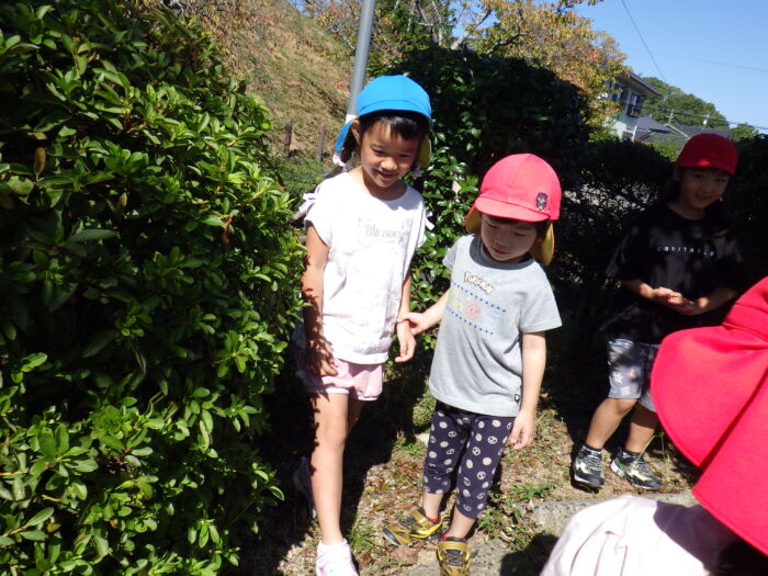 うめ組さんが顔を隠して待っているところに、もも組さんはペアのお友達を探して見つけに行きます。