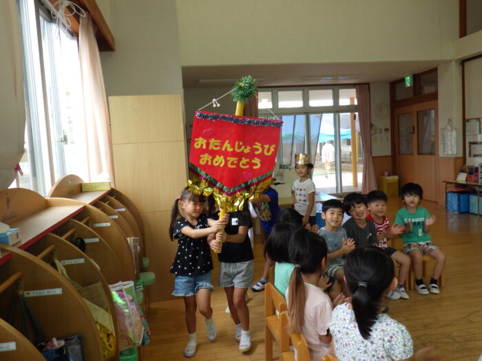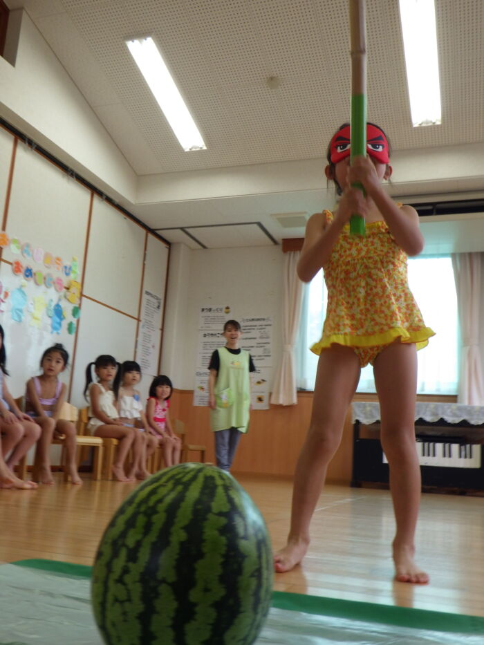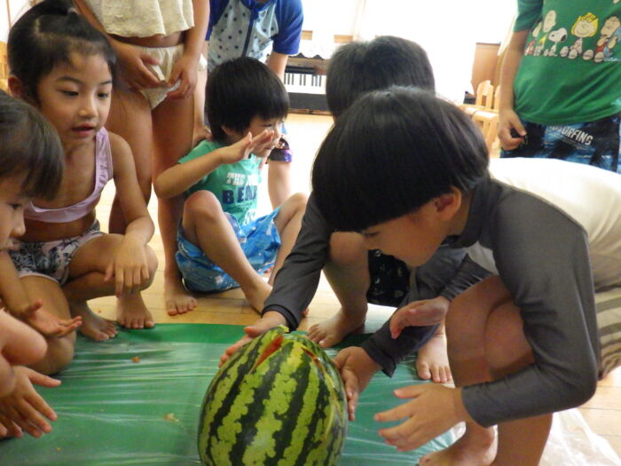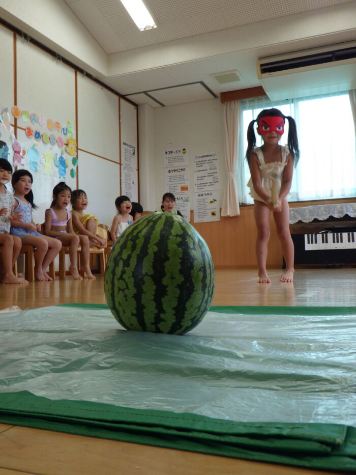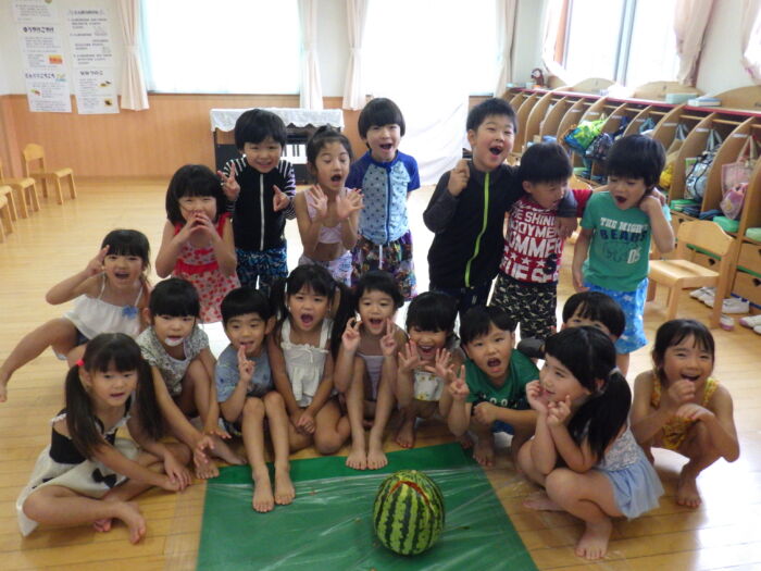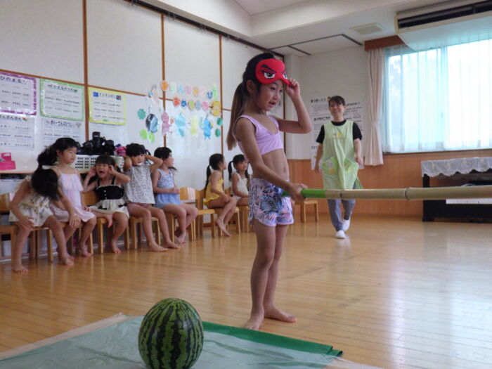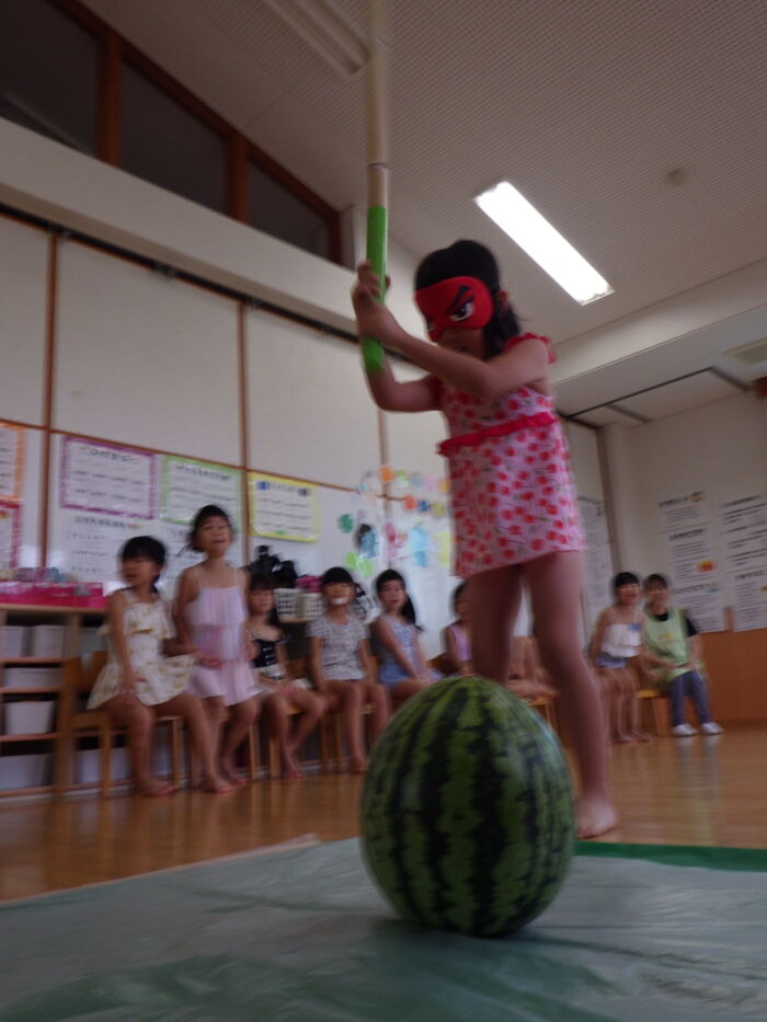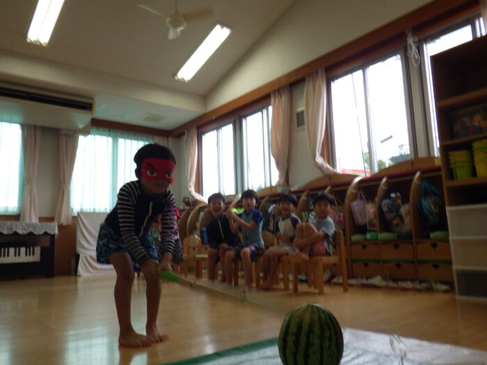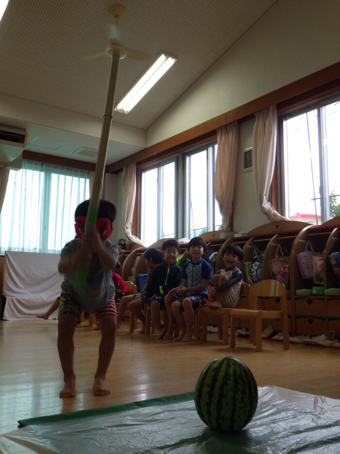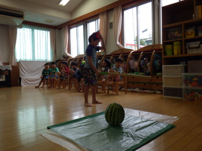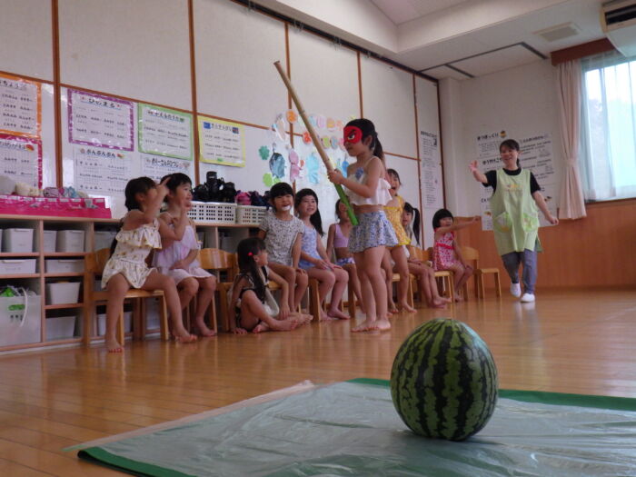 8月生まれさんの誕生会がスタートしました!お当番さんがエスコートしてくれています✨ 「これから8月生まれさんの誕生日会をはじめます」と始まりの言葉を言いました☆ 皆で元気よく、園歌と「おばけなんてないさ」を歌いました! インタビューでは、「好きな遊びはなんですか?」「すきなアイスはなんですか?」など、大きな声で質問し、誕生児のお友だちは嬉しそうに答えていましたよ♫ お祝いの言葉を先生に読んでもらうと思わずニコニコしてしまう子ども達でした(^^) ✨おたんじょうびおめでとう✨  良い一年になりますように…♪ 誕生会の後は皆が楽しみにしていたスイカ割り大会です!目隠しをしてやる気十分です! 友達の応援「みぎ!ひだり!」を聞いて進みながら頑張っています✨ 今度こそ!今度こそ!と友達の声を頼りに挑戦しました! せーのっ 惜しかったね!! 全員挑戦しましたが、スイカは固く…最後は先生が挑戦し見事割れて皆で喜びました♪