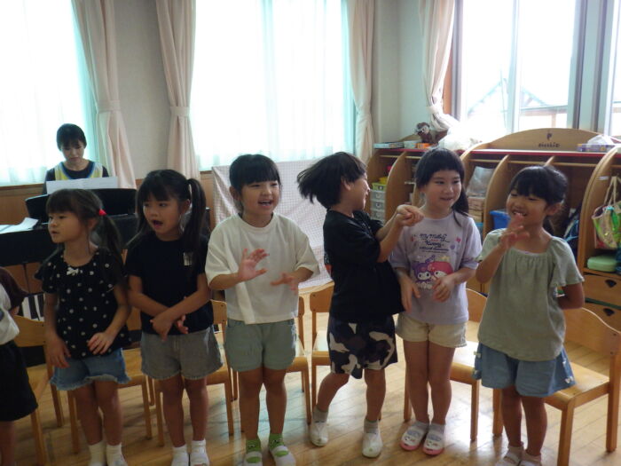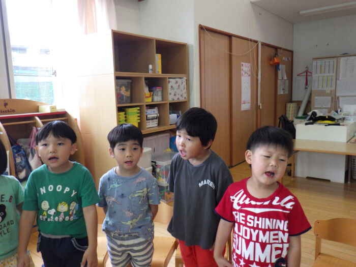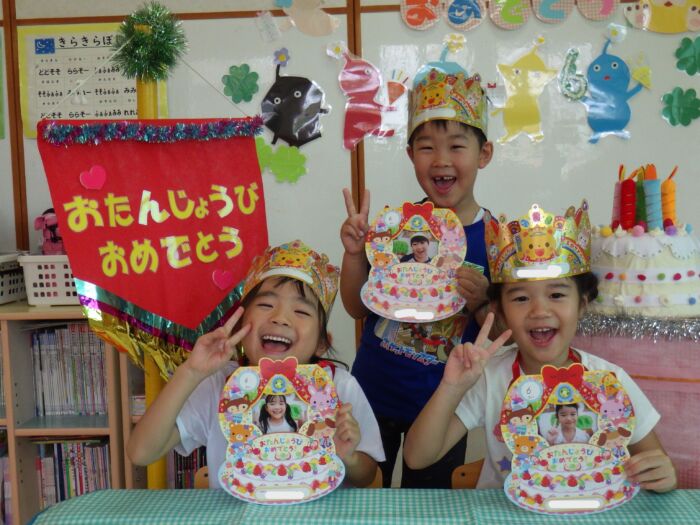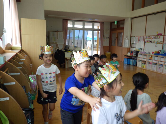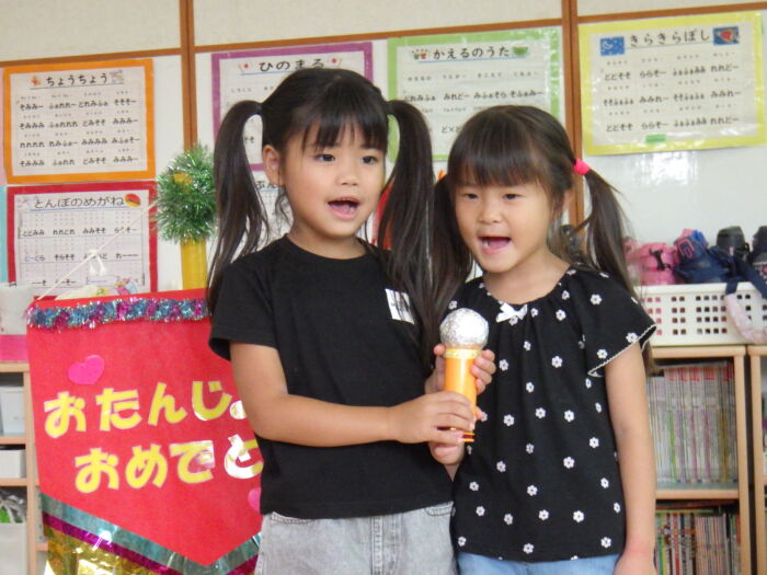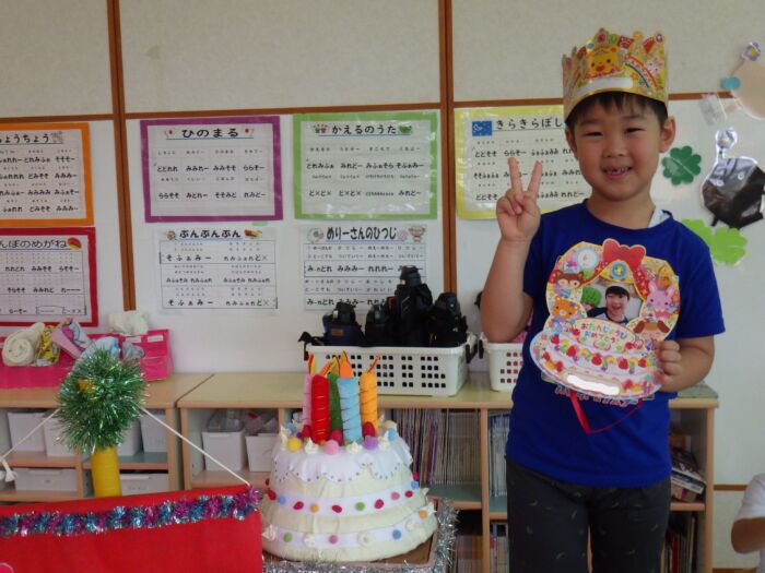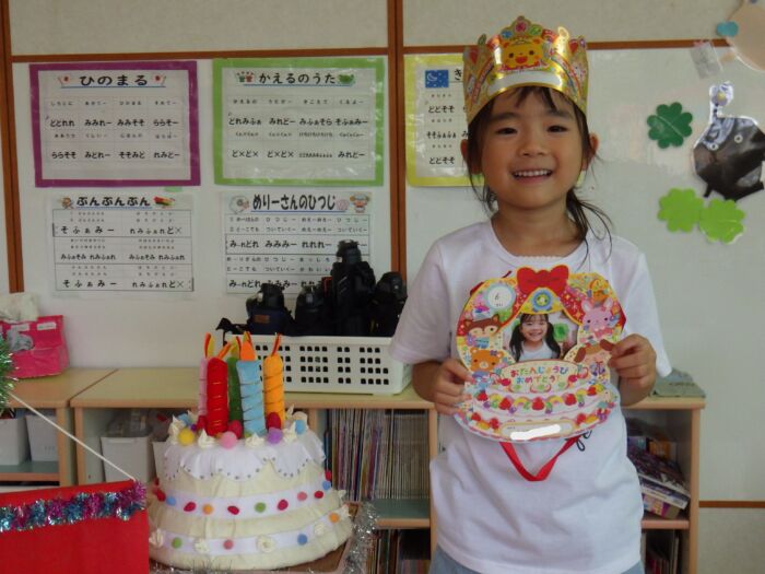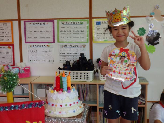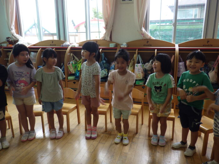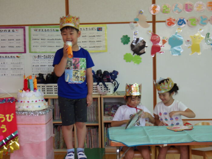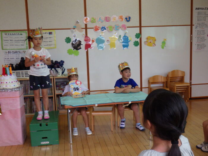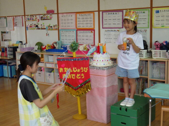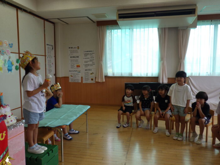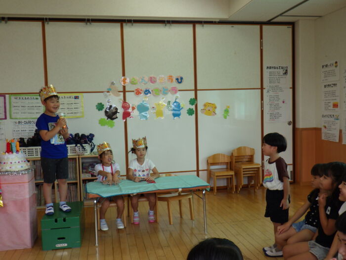 8月生まれさんの誕生会がスタートしました!お当番さんがエスコートしてくれています✨ 「これから8月生まれさんの誕生日会をはじめます」と始まりの言葉を言いました☆ 皆で元気よく、園歌と「おばけなんてないさ」を歌いました! インタビューでは、「好きな遊びはなんですか?」「すきなアイスはなんですか?」など、大きな声で質問し、誕生児のお友だちは嬉しそうに答えていましたよ♫ お祝いの言葉を先生に読んでもらうと思わずニコニコしてしまう子ども達でした(^^) ✨おたんじょうびおめでとう✨  良い一年になりますように…♪ 誕生会の後は皆が楽しみにしていたスイカ割り大会です!目隠しをしてやる気十分です! 友達の応援「みぎ!ひだり!」を聞いて進みながら頑張っています✨ 今度こそ!今度こそ!と友達の声を頼りに挑戦しました! せーのっ 惜しかったね!! 全員挑戦しましたが、スイカは固く…最後は先生が挑戦し見事割れて皆で喜びました♪