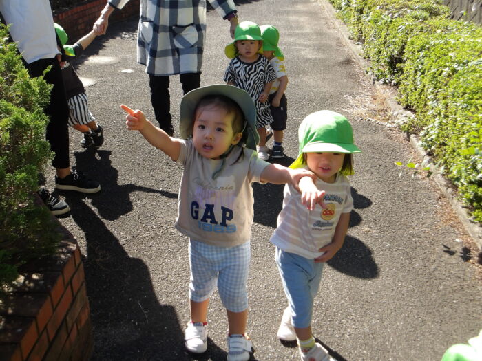 お友達と手を繋いで、車を見たりお花を見たり。