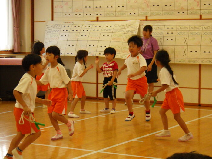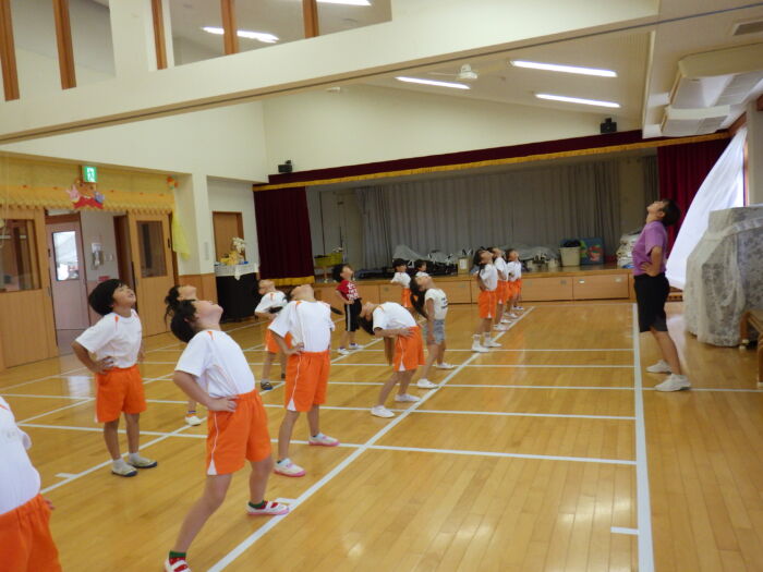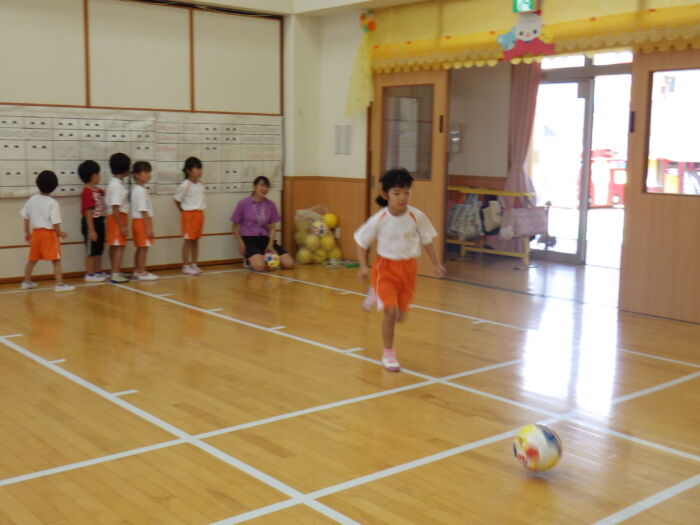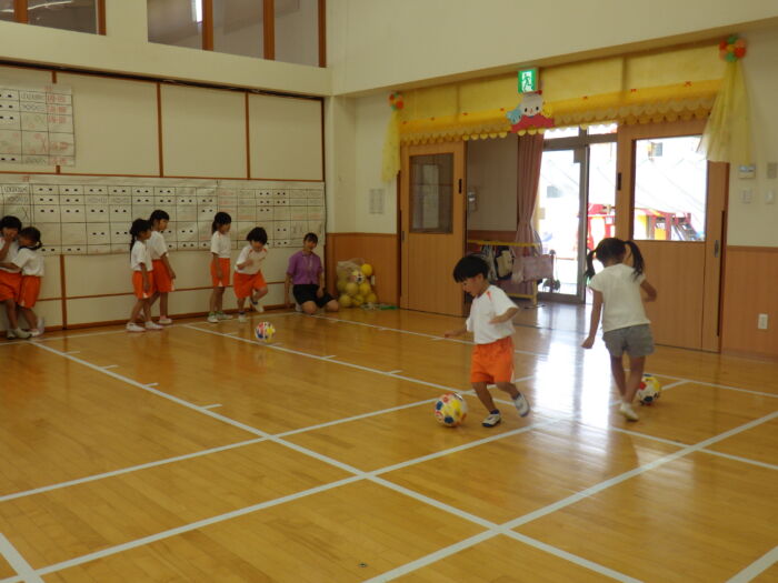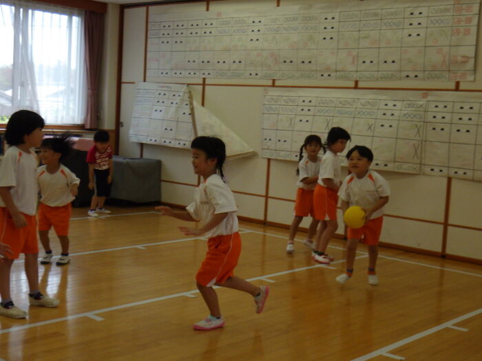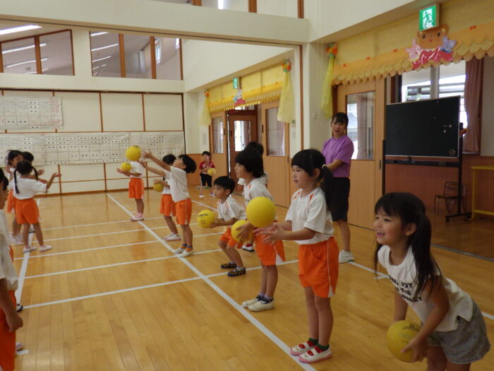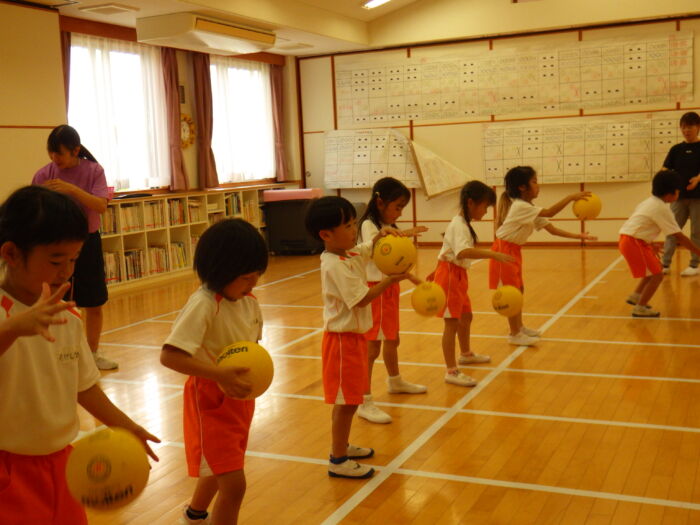 うめ5歳児 ~体操教室~《うめ組》 2025年10月7日 55 組体操に一生懸命取り組んできた子ども達。運動会では素晴らしい演技を見せてくれました✨ 今日はいつもの体操からはじまり、講師の先生の話を聞きながらボールを使った動きをしました☆ 縄跳びを渡された人はオニをチェンジ!! ボールを足やお尻で止めたり、ドリブルをしてみたり… 最後はドッチボールをして楽しみました!!これからもしっかり話を聞いて、約束やルールを守れるようにしていこう!